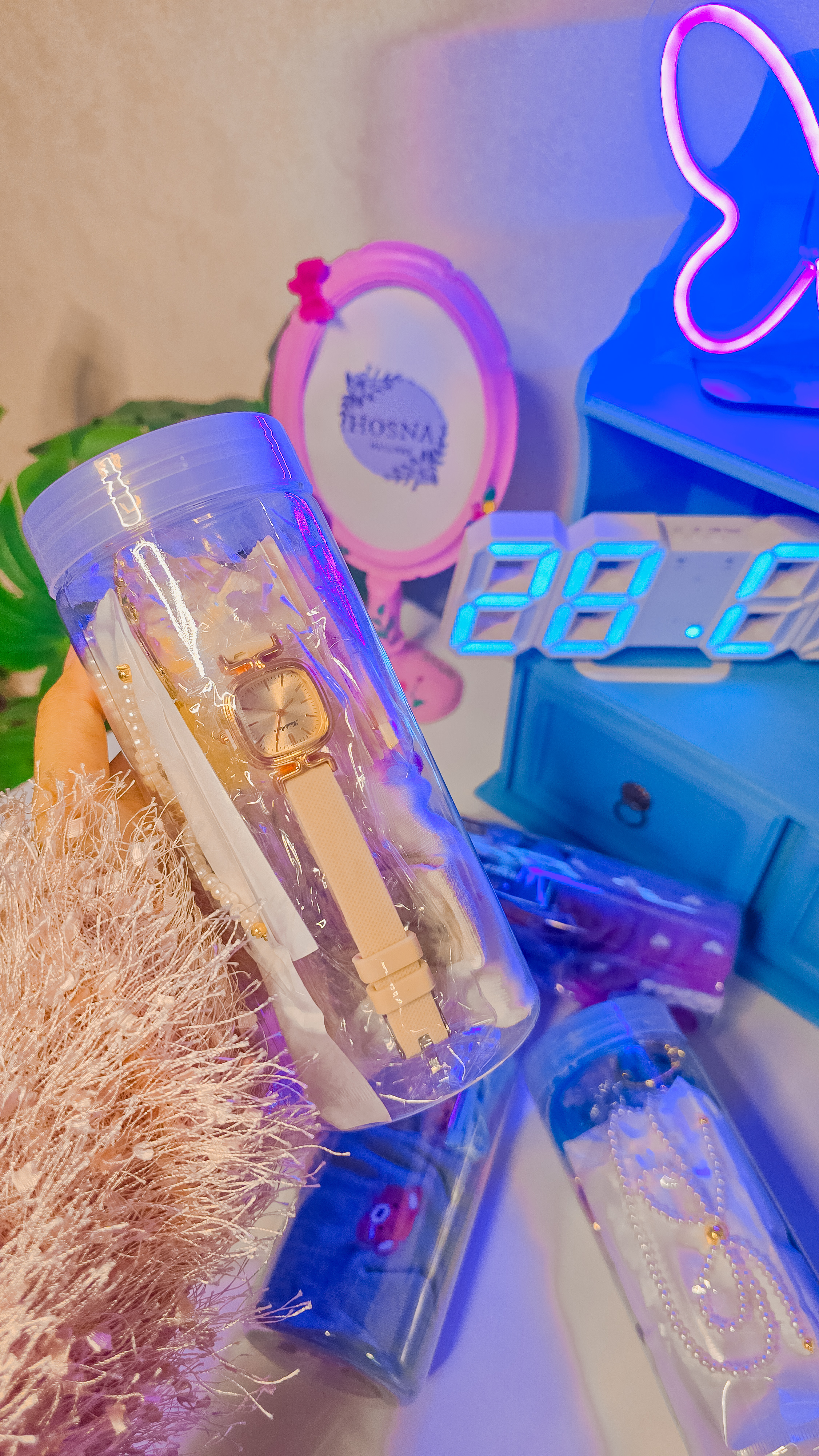 ساعت، برای یادآوری لحظههای قشنگ، جوراب، برای قدمهای پر از شانس، گوشواره، برای درخشش و زیبایی، جاکلیدی، برای باز شدن درهای خوشبختی، گلسر، برای لطافت و عشق و گردنبند پاپیونی، برای ظرافت و خاص بودن.